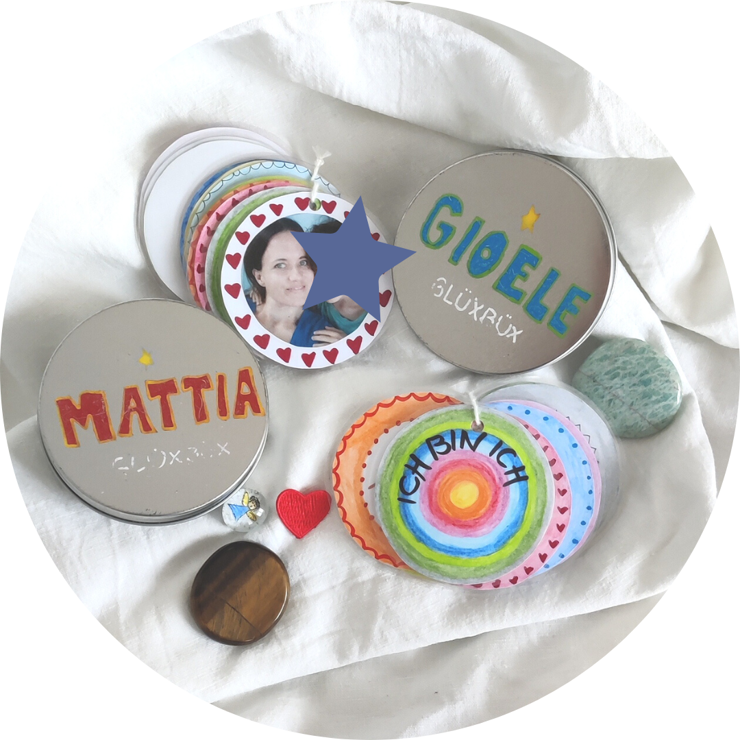Der Ursprung der Glücksbüx auf einem Bild. 2 Stahlblechdosen, handbemalt mit den Namen der Kinder, Fächer mit Affirmationskarten, farbig handgemalt, Kraftsteine in braun und türkis, sowie weitere Glücksbringer wie ein Glasnugget mit Schutzengel.